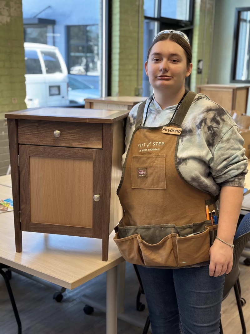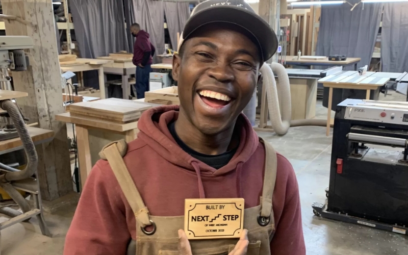 Curiosity is what led Fatayi to join Next Step’s Wood Product Manufacturing program, a pilot training program offered in partnership with Lighthouse Academy in Grand Rapids, MI. According to Fatayi, the experience opened his eyes to the world of wood. Awed by the tools and grateful for the patience of his instructor Roger, he created a beautiful end table which later won 1st prize at an arts and crafts exhibition. After graduating from Next Step’s program, Fatayi returned to serve as an intern. More recently, Fatayi joined the Next Step team as Assistant Training Instructor, working alongside students and Lead Instructor Roger Visker.